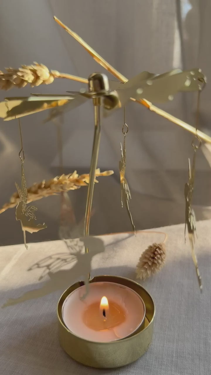 Detta änglaspel med gyllene älvor fångar ljuset och låter det dansa i rummet. En vacker detalj som ger rummet en sagolik känsla och ett varmt lugn.